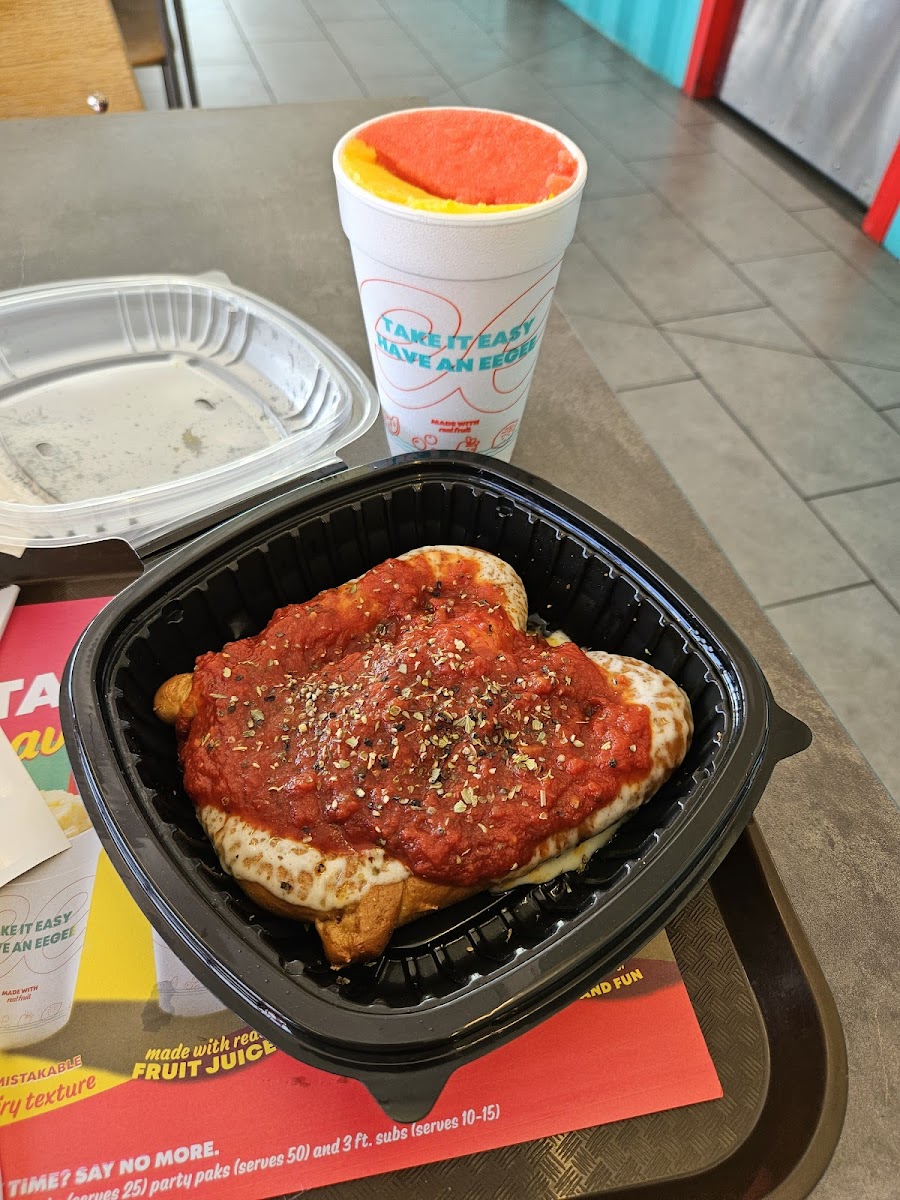 When it comes to the food, Eegee's offers a unique twist on classic comfort foods. One of their standout dishes is Ranch Fries, crispy and golden fries smothered in creamy ranch dressing that make the perfect side or snack. For something more indulgent, try the Pizza Pretzel, a warm, cheesy, and savory treat that combines the best of pizza and pretzels. The Cheese Grits are another crowd-pleaser, creamy, cheesy, and just the right balance of flavors. Don’t forget to wash it all down with one of their refreshing Juices, perfect for pairing with any meal. For sandwich lovers, the Pizza Sub is a must-try, offering a hearty and satisfying combo of pizza toppings inside a fresh sub roll.